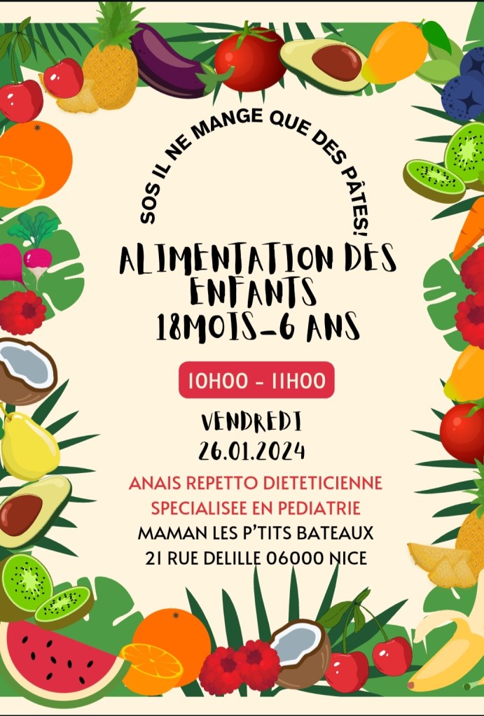 Je vous accueille tous les lundis dans le centre dédié à la périnatalité et à la parentalité MAMAN BULLE. Les mardis ou jeudis je vous reçois au 87 avenue Henry Dunant à Nice Nord (cabinet jouxtant la pharmacie). Je propose aux structures accueillant des enfants, des parents ou des futurs parents des interventions sur la nutrition pédiatrique.